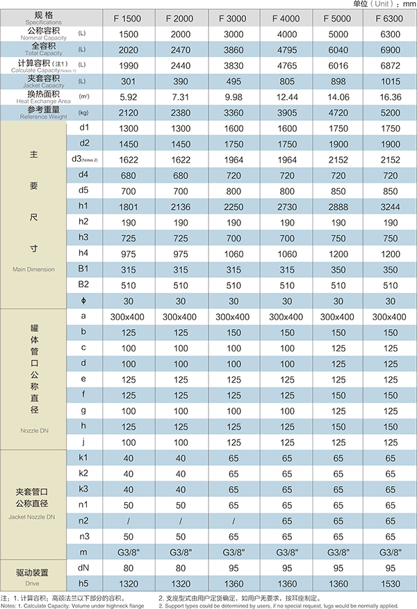 F1500L-F6300L閉式搪玻璃反應釜(閉式搪瓷反應釜)設計圖紙及參數如下所示: