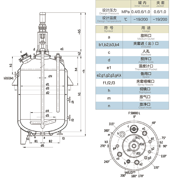 F8000L-F50000L閉式搪玻璃反應釜(閉式搪瓷反應釜)設計圖紙及參數如下所示: