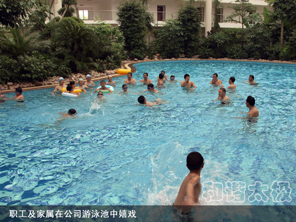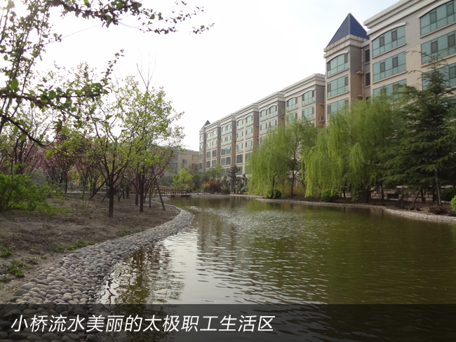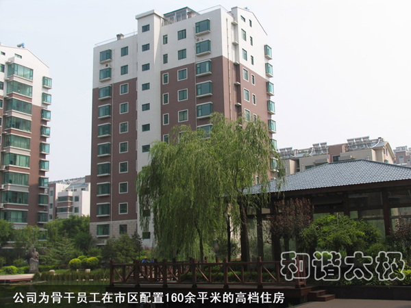 2008年,太極公司投資近8000萬元建成了職工公寓樓3座,戶外綠樹溪湖環繞,每戶面積170平米,統一配置60寸夏普電視等。所建成的職工單身公寓樓采用四星級標準,共176間房,人均戶面積50平米,統一配置電視、網絡、洗浴間、床柜、空調、暖氣、桌椅等。而且單身公寓內設有3000余平方米的生態園林和高檔游泳池,一年四季綠樹茂盛常春。