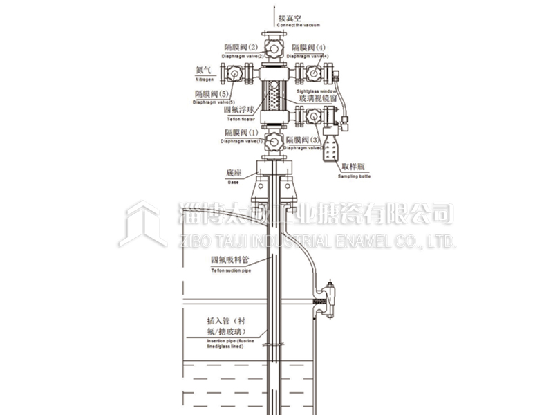 太極反應釜手動取樣系統(MANUAL SAMPLING SYSTEM FOR REACTORS)為防腐手動取樣裝置。取樣物料接觸各部件均采用里襯PFA、襯氟材質,達到防腐目的;四氟吸料管配套插入管(襯氟/搪玻璃材質)浸于釜內料液以下,增加其過程的穩定性。通過抽真空將物料在系統中安全、快捷取樣。