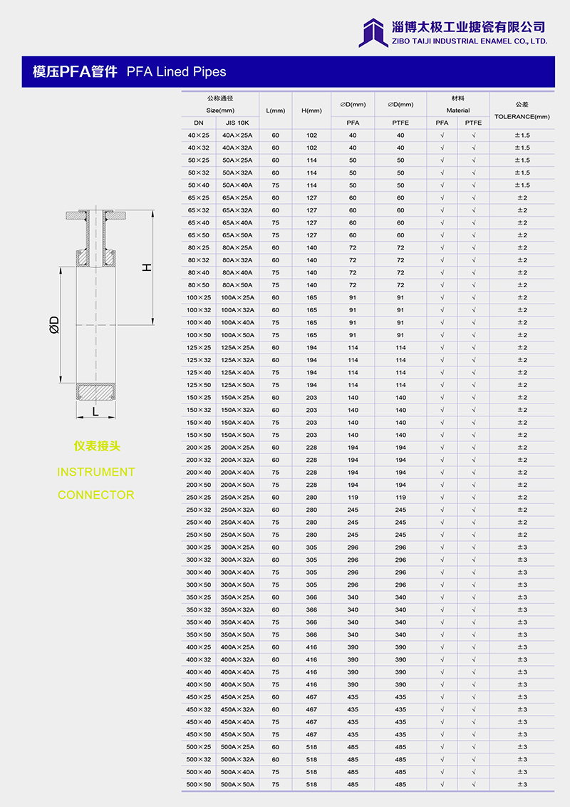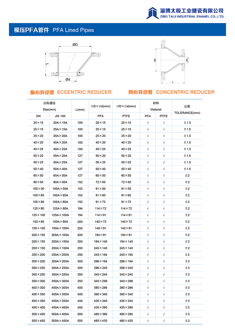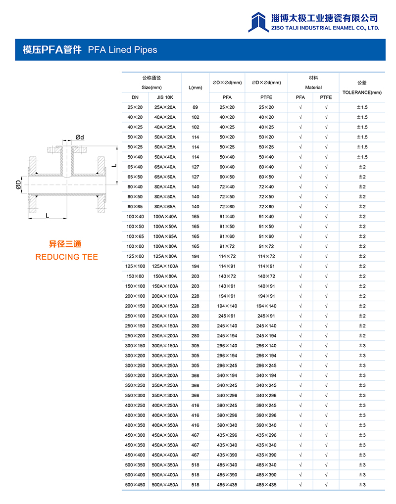 本公司的模壓PFA管件,采用耐強(qiáng)腐蝕的PFA材料,具有高密度、高強(qiáng)度和襯層厚度均勻等特點。每一個尺寸要求都精確控制,從模具加工精度到成型后的氟塑料加工精度都精益求精。