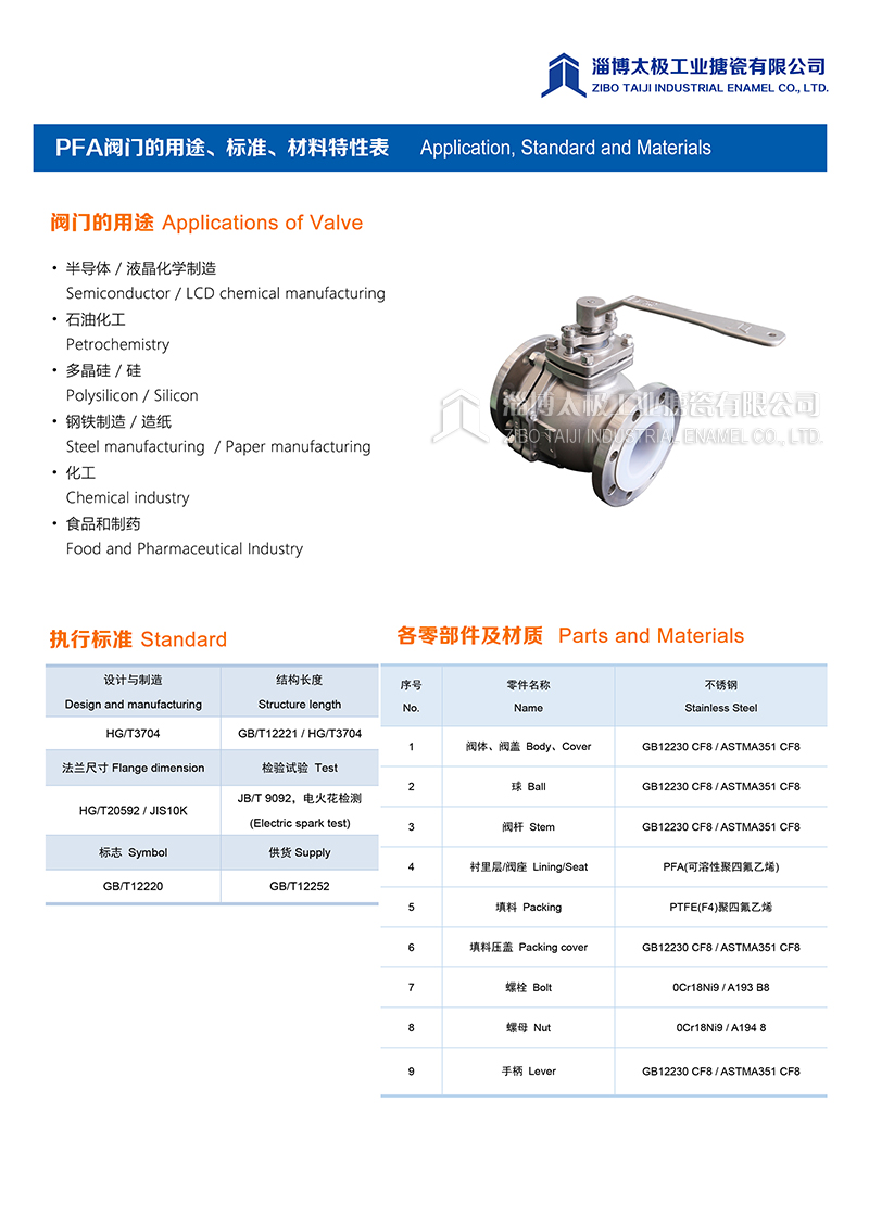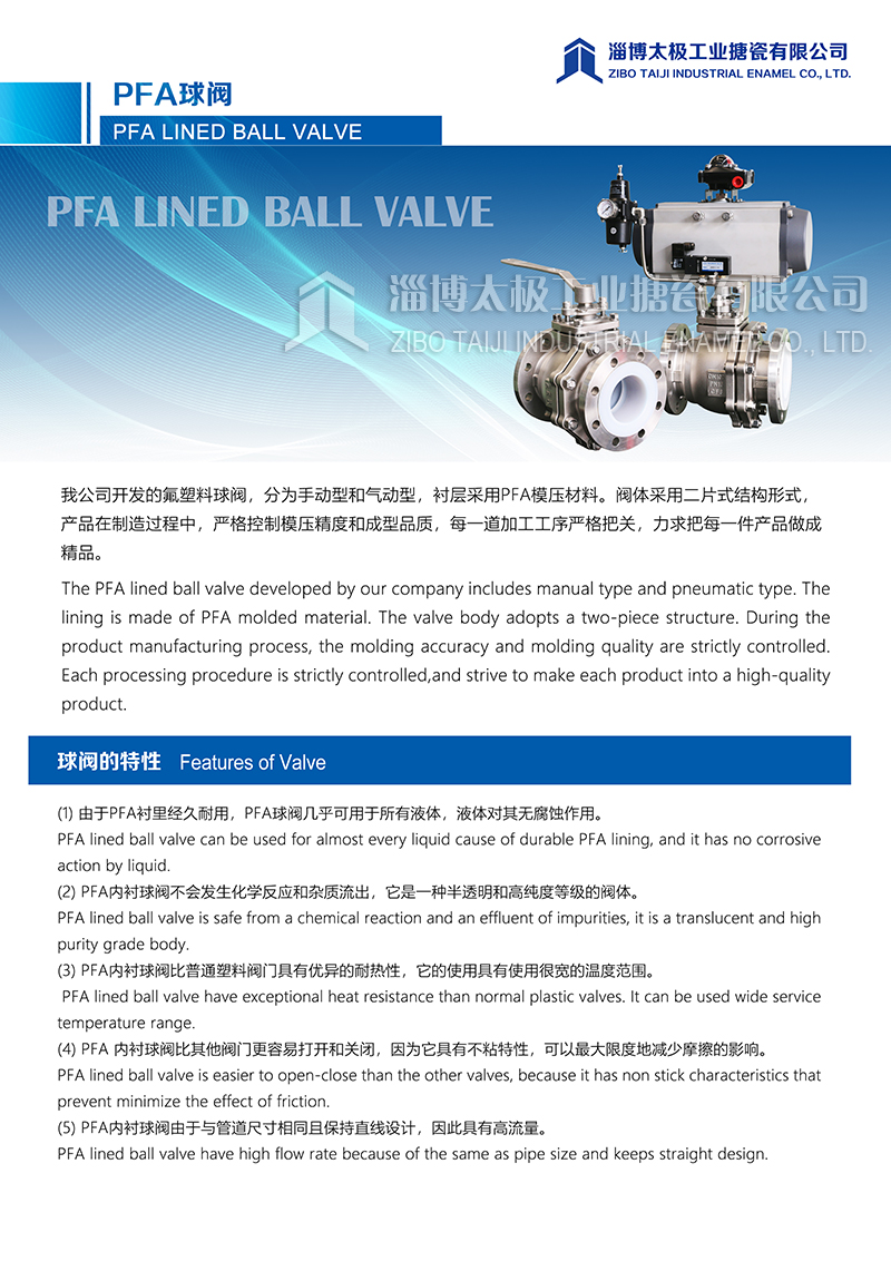 我太極公司開發(fā)的氟塑料球閥(PFA球閥),分為手動型和氣動型兩種類型,襯層采用PFA模壓材料。閥體采用二片式結(jié)構(gòu)形式,產(chǎn)品在制造過程中,嚴(yán)格控制模壓精度和成型品質(zhì),每一道加工工序嚴(yán)格把關(guān),力求把每一件產(chǎn)品做成精品。